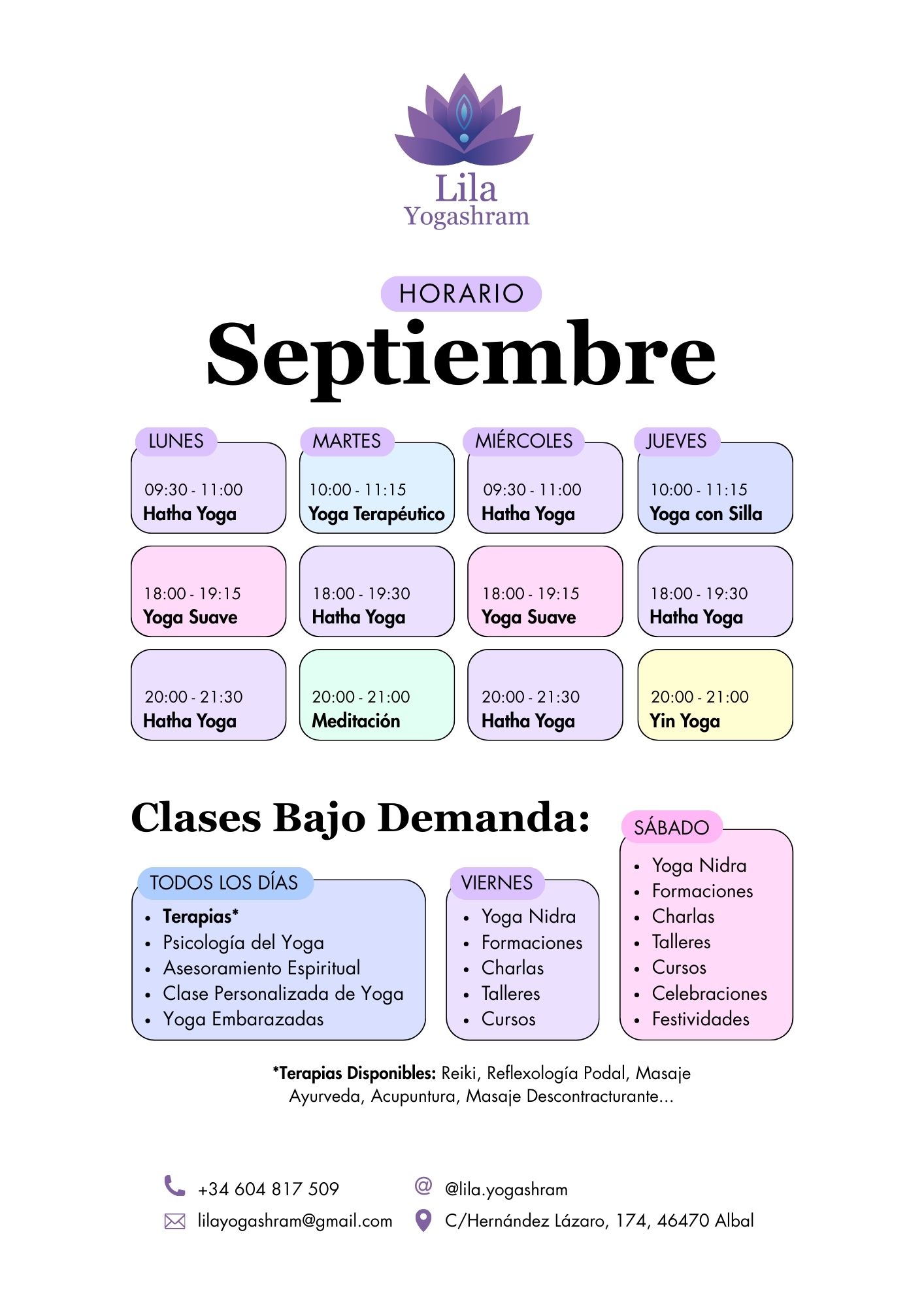 Estos son los horarios semanales actuales de clases de Hatha yoga, Yoga con silla, Yoga suave y Meditación + Pranayama